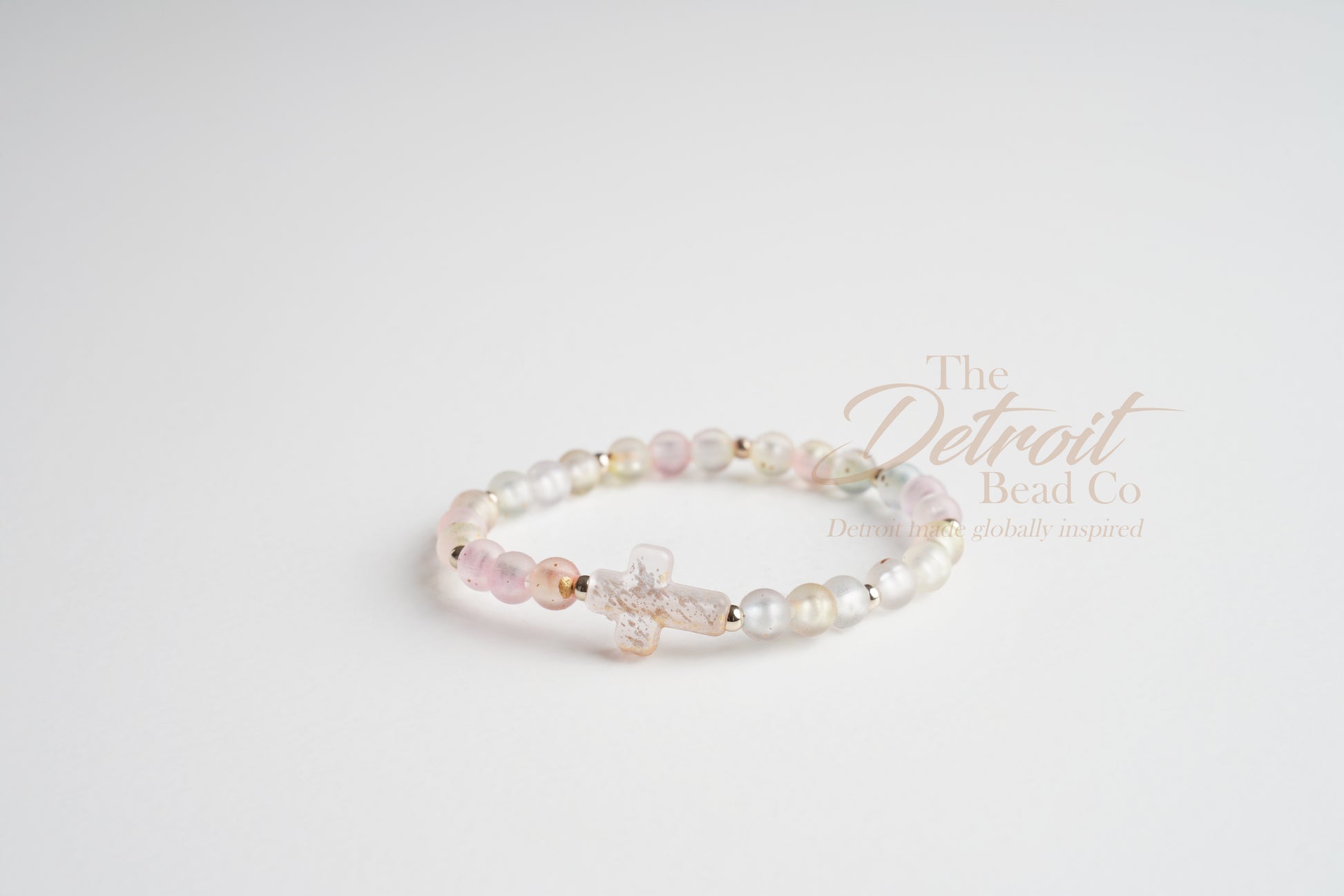 At the center, a gold-filled cross adds warmth and intention, balancing the soft hues with timeless symbolism. Designed on a comfortable, stretchy elastic cord, it slips on effortlessly while maintaining an elegant, refined look.